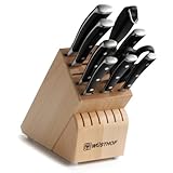 The Classic Ikon 10-piece block set includes 3-1/2-inch parer, 4-1/2-inch utility, 5-inch serrated utility,6-inch sandwich knife,8-inch carving knife, 8-inch bread knife, 8-inch cooks knife, 10-inch steel, kitchen shears and a 17 slot storage block,Wusthof Classic Ikon is a culmination of all the best features of each of the Wusthof knife lines. The combined riveted handle design is combined with a contoured shape to add comfort and control. The Classic Ikon adds a rear bolster that acts as a counter balance when using the knife.This second bolster adds significant blade control.Classic Ikon has a unique forward bolster as well.The forward partial bolster is designed so you can sharpen the complete length of the blade.This bolster is also curvered inwards to allow your fingers greater control while holding the knife by the blade.Located in The Cutlery Capital of the World, Solingen Germany, the Wusthof factoryhistory goes back as far as 1814 when the company was listed with the Duchy of Berg. To this day, the company remains family owned.Throughout it's history, Wusthof has focused almost solely on the manufacturing of forged knives for the professional chef and home cooking enthusiast.Wusthof uses a special blend of German steel through out the whole length of the knife. The ingredients of this steel are proudly etched on each blade. Wusthof not only uses the best materials to make a fine knife,but it is also crucial that each blade is precisely tempered.This tempering allows the knife to hold its edge for an extremelylong time, yet still be able to be maintained in your home kitchen with out the need to be sent away for maintenance. Our unique compound angle is not seen in many knives.This angle tapers from the spine of the knife to the edge to allow for a sturdy, yet extremely sharp edge while it also tapers from the bolster to the tip to give the knife strength as well as flexibility.